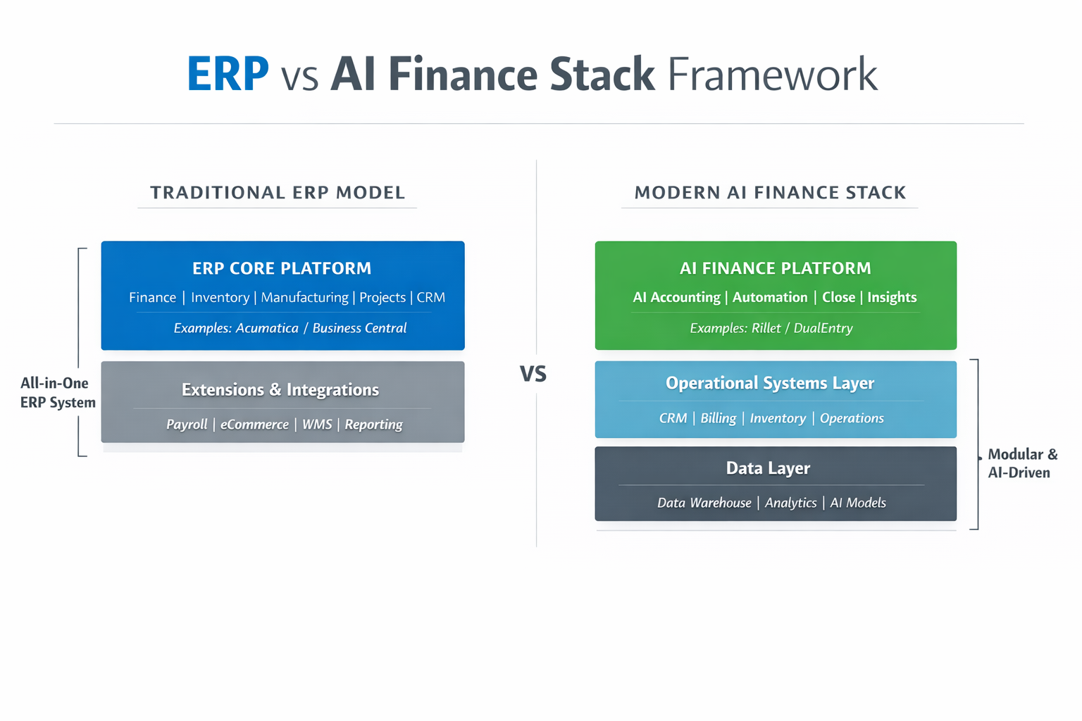 ERP alone doesn’t solve everything anymore. Today’s technology landscape includes AI‑driven financial automation, specialized operational systems, and modern data platforms.